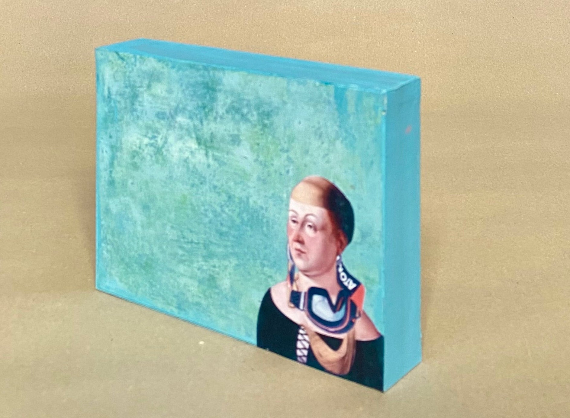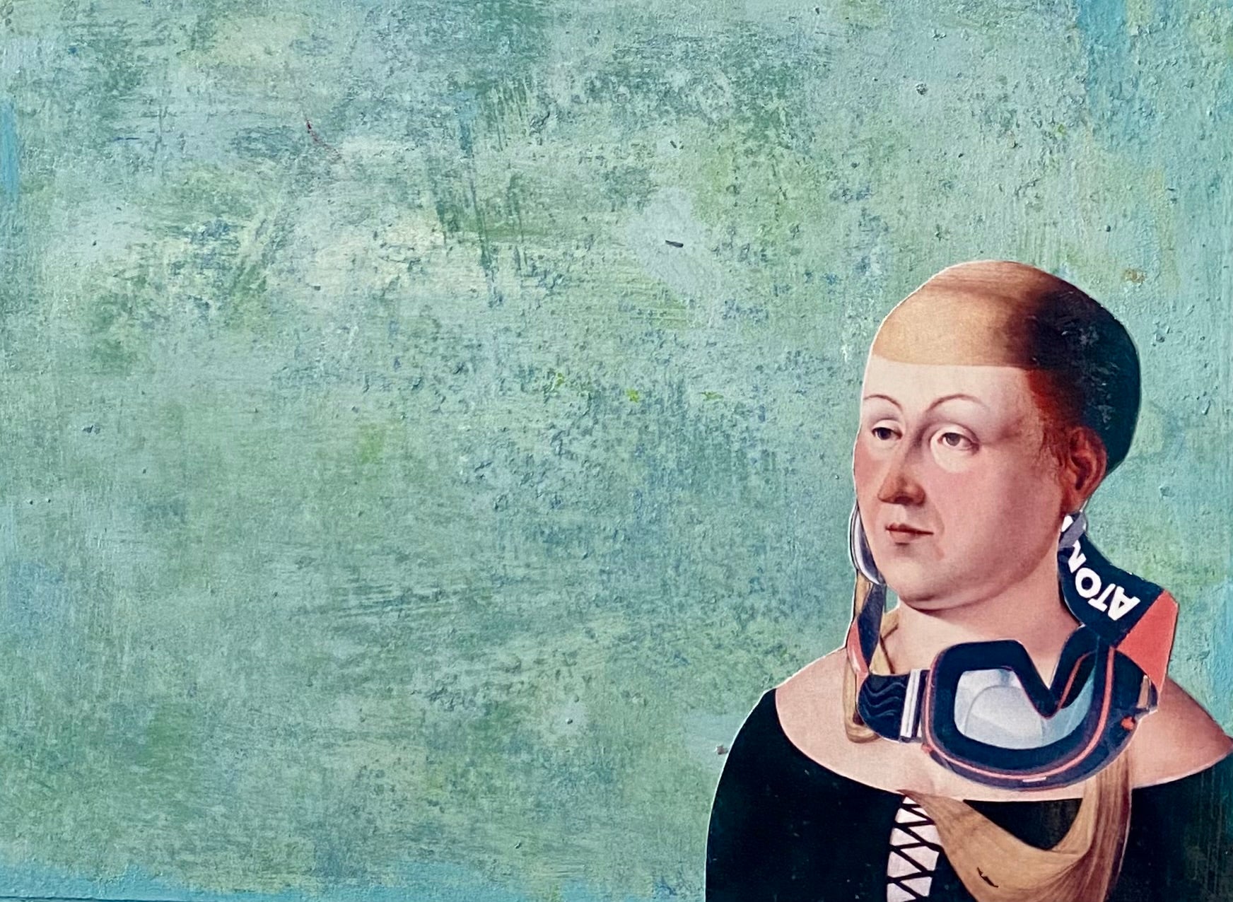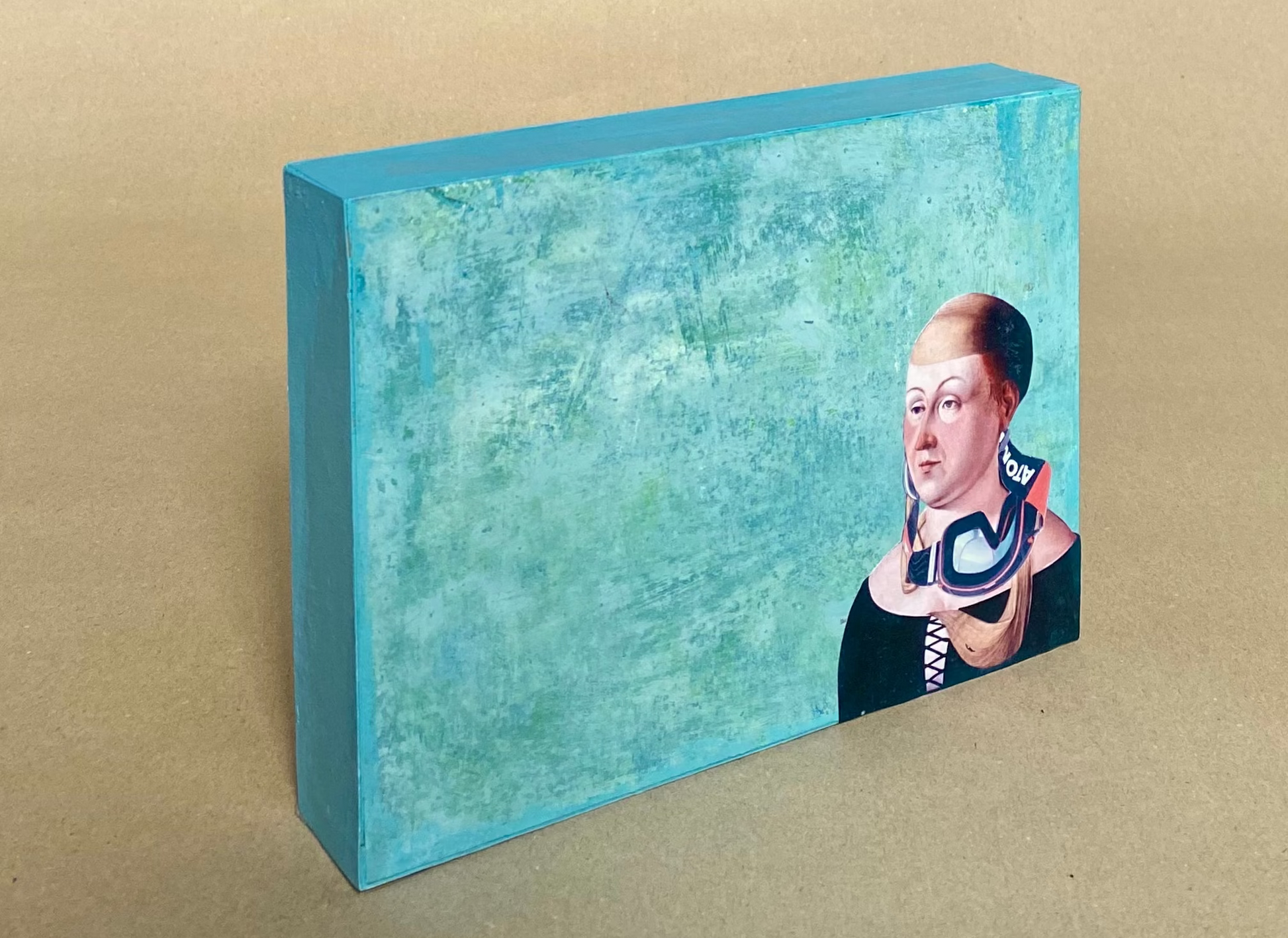 An ongoing, open-ended series of collages. Each piece features two contrasting images set against mostly monochrome acrylic backgrounds: a reference to a well-known painting from the history of Italian art, paired with a mundane everyday object. Art & trash, so to speak, a contemporary reinterpretation, laced with a subtle touch of irony.
